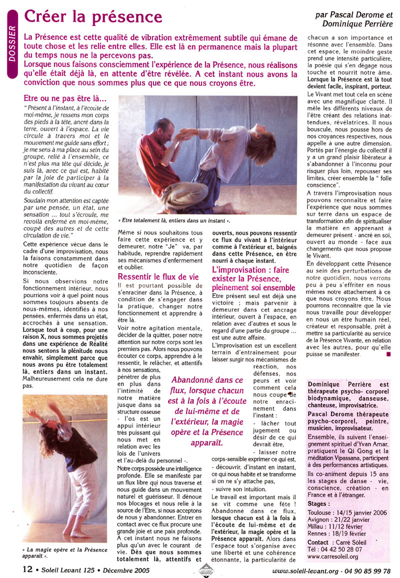 Être présent seul est déjà une victoire ; mais parvenir à demeurer dans cet ancrage intérieur, ouvert à l’espace, en relation avec d’autres et sous le regard d’une partie du groupe ... est une autre affaire. L’improvisation est un excellent terrain d’entraînement pour laisser surgir nos mécanismes de réaction, nos défenses, nos peurs et voir comment cela nous coupe de notre enraci-nement dans l’instant :
